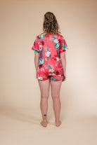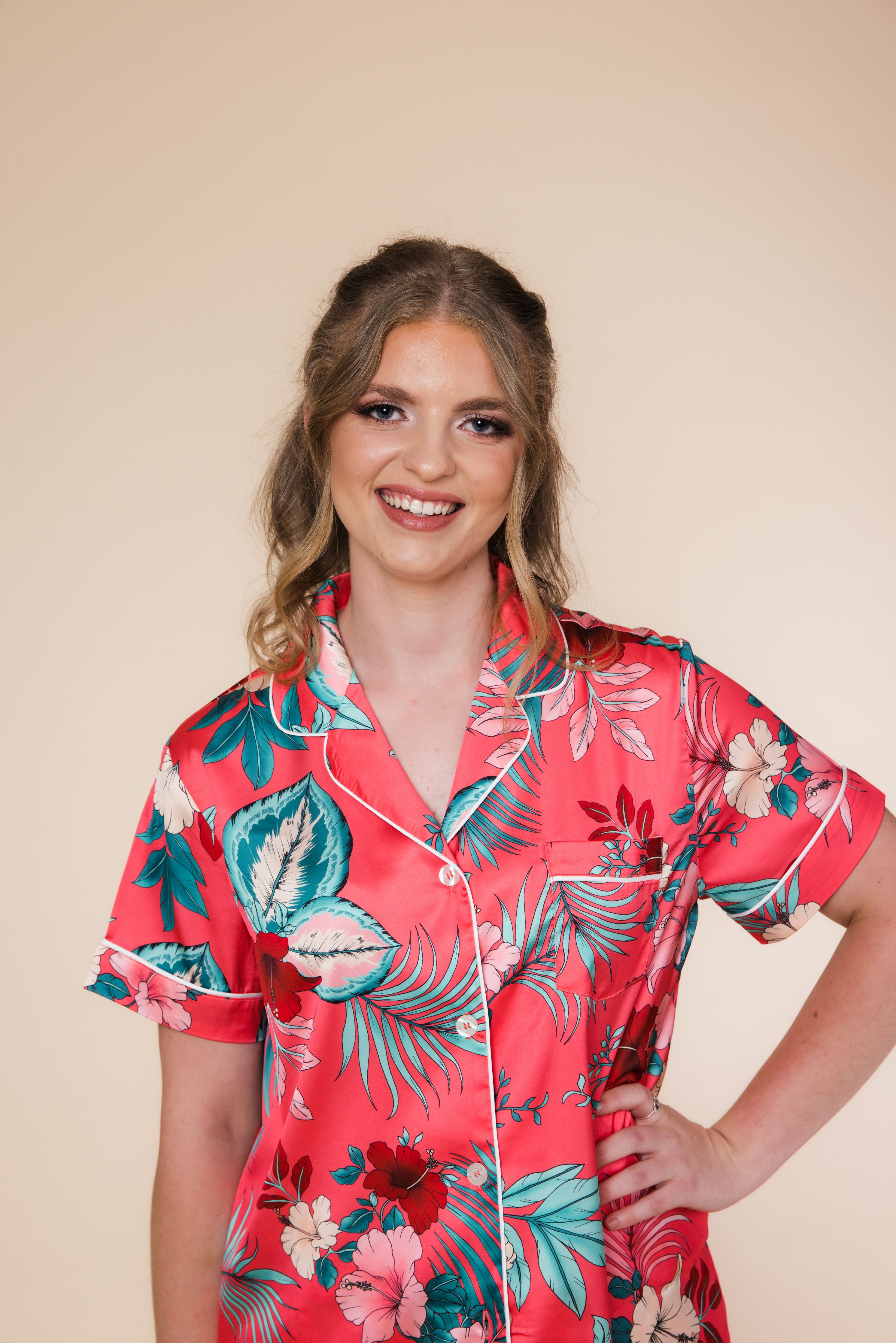 Inspired by the vibrant colours of the tropics, these PJ's effortlessly combine style and comfort. Featuring stunning pink hues, these vibrant pyjamas are sure to make a statement wherever you go. These PJ's combine a soft silky fabric, with pearl piping, custom Sunnie buttons and great attention to detail. These PJ's will bring the fun, whatever the occasion.